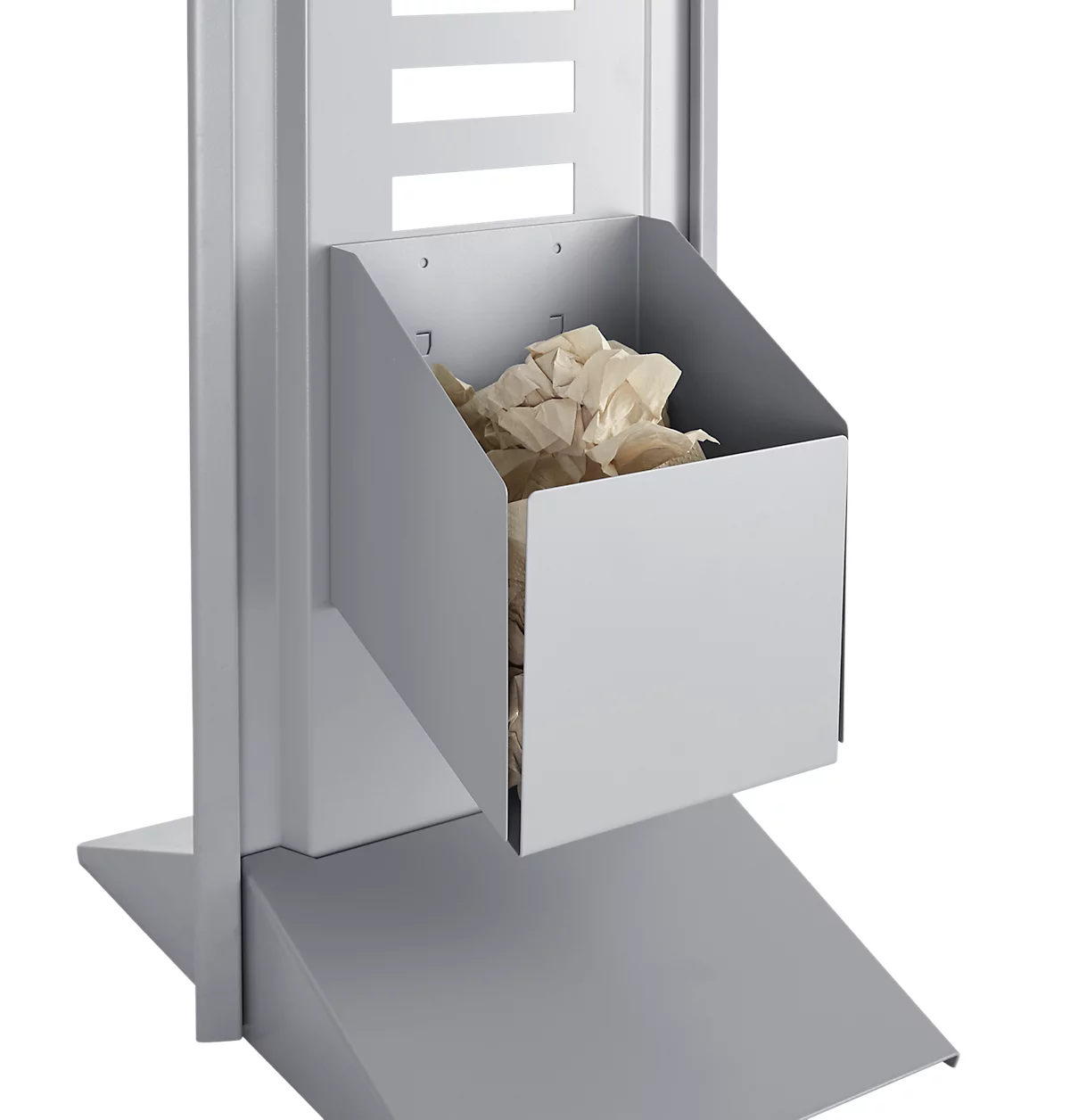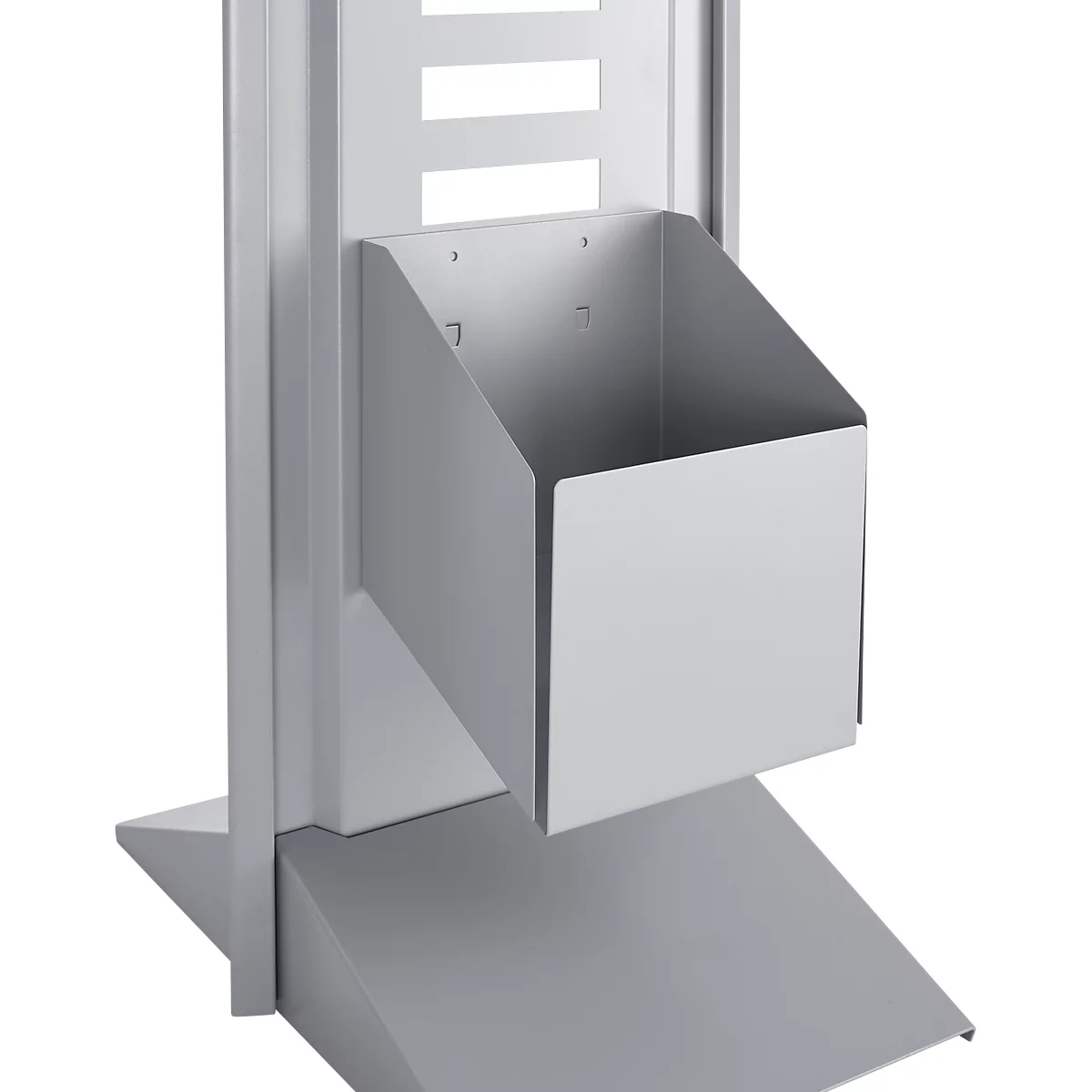 Der Abfallbehälter besteht aus hochwertig pulverbeschichtetem Stahl. Passend zur Farbgebung der Hygienestation ist er in Weißaluminium RAL 9006 gehalten.