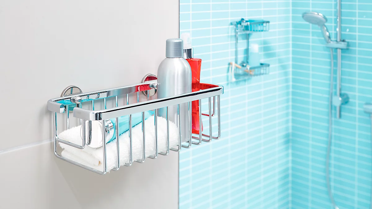 Duschkörbe der Serie ALUXX von tesa® sind nicht nur eine optimale Aufbewahrungslösung für Bad und Dusche, sondern dank der Hochglanzverchromung des leicht abgerundeten Aluminium-Gestells auch optisch ein schicker Akzent, der in so gut wie jedes Bad passt.
