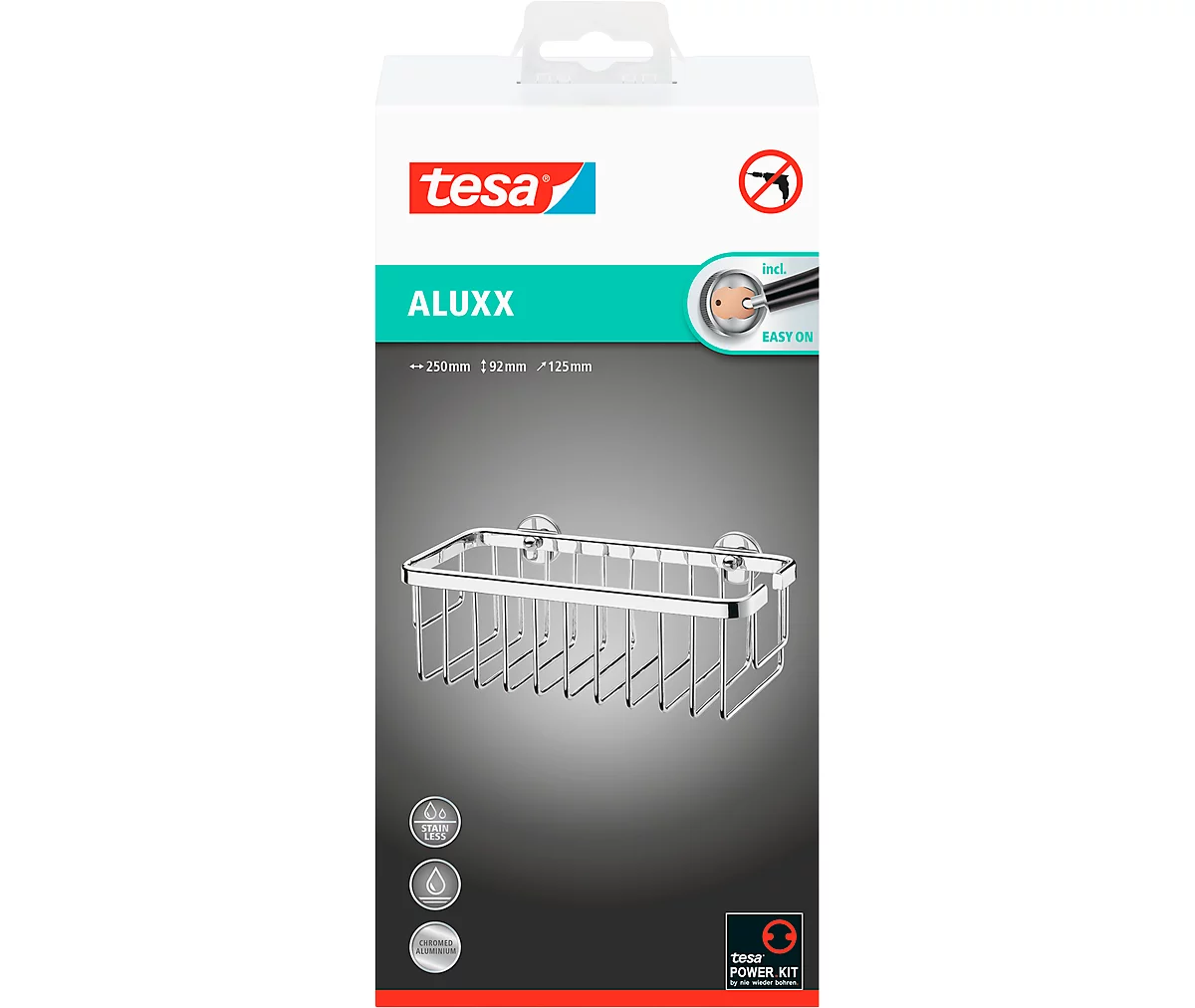 Der Duschkorb ALUXX von tesa® bietet viel Platz für Shampoo und Duschgel und lässt sich ohne Schäden an den Fliesen befestigen. Der dekorative Duschkorb besteht aus verchromtem Aluminium.