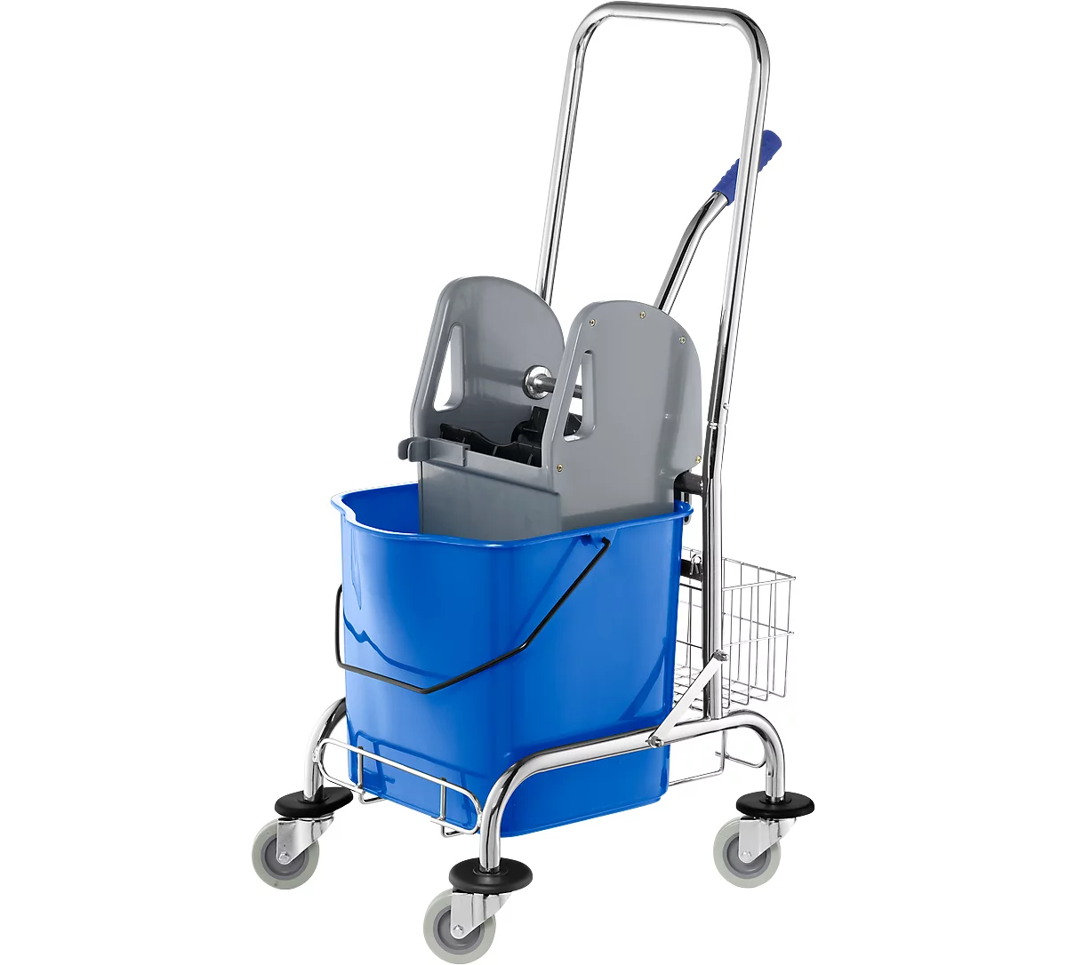 | Ausstattung | Eimer blau, 27 Liter, Mopp-Presse aus Kunststoff, leichtgängige Räder mit Stoßabfangscheiben |