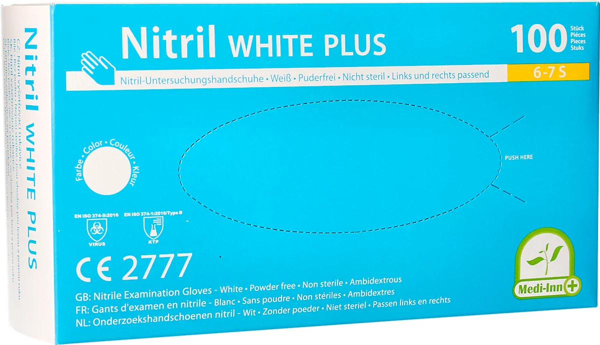 Die nicht sterilen Einmalhandschuhe Nitril White Plus von Medi-Inn® PS sind sowohl links als auch rechts passend und zu jeweils 100 Stück pro Paket in unterschiedlichen, einheitlichen Größen erhältlich.