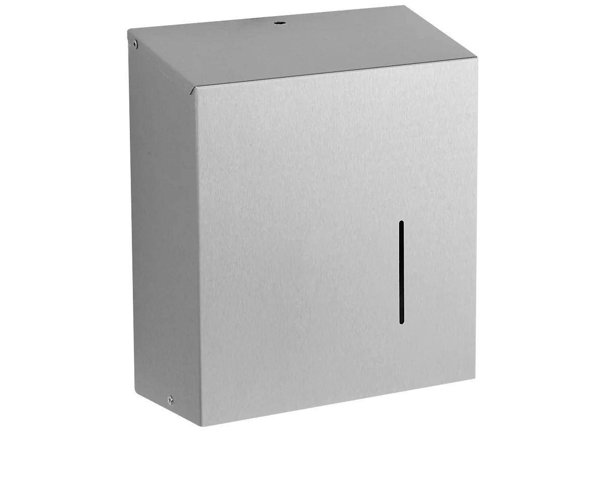 Robuster Spender aus Edelstahl für Industrie, Gastronomie und öffentliche Einrichtungen. Pflegeleicht und hygienisch. Abschließbar, für ca. 350 Blatt Standard-Faltpapier-Handtücher in C- oder Z-Faltung sowie Interfoldpapier.