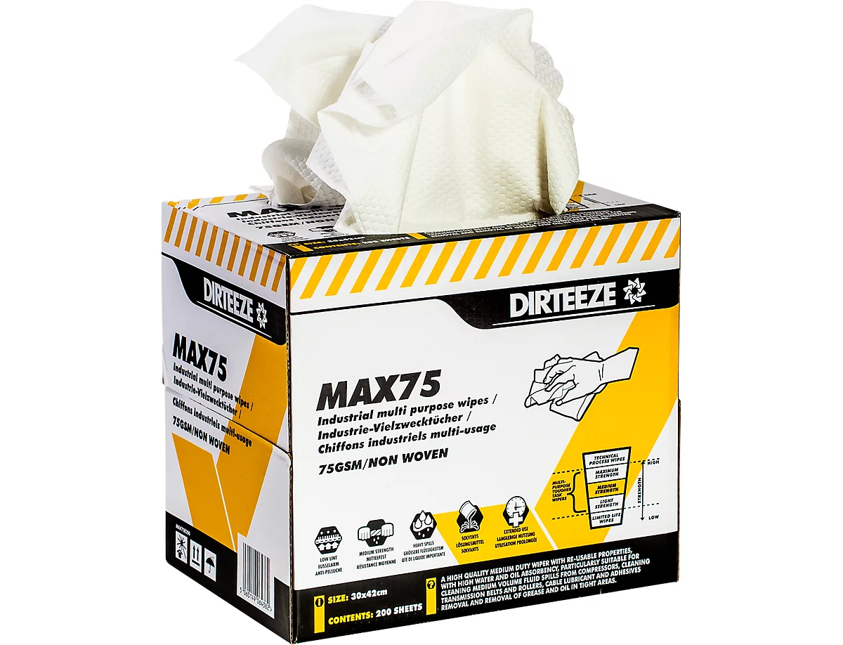 Die wiederverwendbaren High-Tech-Wischtücher MAX75 nehmen Öl und Wasser auf und sind ideal für die Beseitigung kleiner Leckagen. Jede Packung enthält 200 der fusselarmen Tücher der Größe L 300 x B 420 mm.