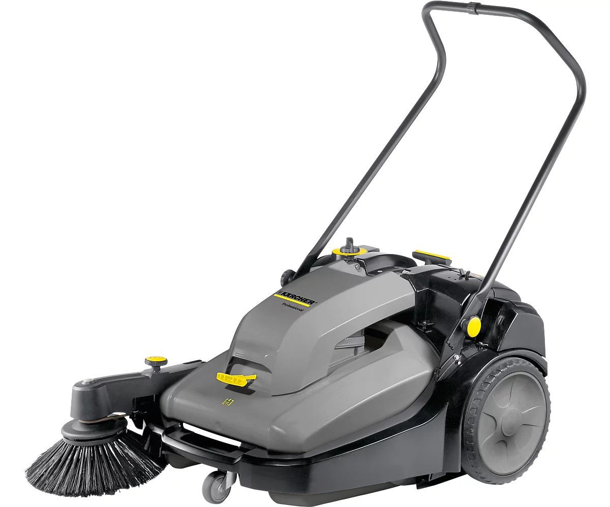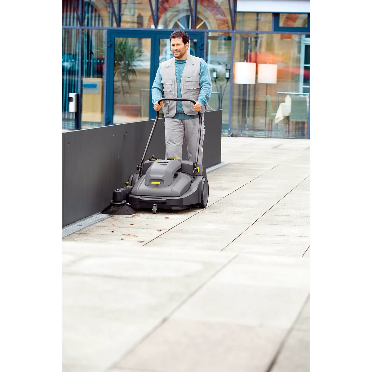 Vorn und hinten sind Tragegriffe montiert für einen leichteren Transport und das bequeme Verladen in ein Fahrzeug. Die großen und nach hinten herausstehenden Räder erweisen sich als nützlich zum Beispiel beim Überwinden von Treppenstufen. Zudem verfügt die KÄRCHER® Kehrmaschine KM 70/30 C Bp Pack Adv über eine Feinstaubabsaugungs-Funktion, die über ein elektrisch betriebenes Sauggebläse realisiert wird. Beim Kehren von nassen Böden ist diese Funktion auch ganz nach Bedarf abschaltbar.
