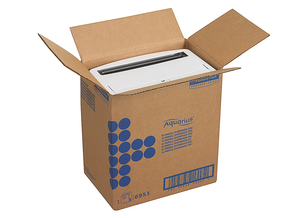 Der weiße Handtuchrollenspender Aquarius Slimroll 6953 der Marke Kimberly Clark hat Abmessungen von L 343 x B 318 x H 191 mm.