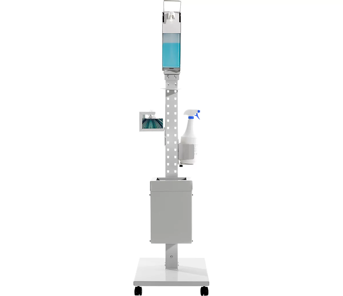 Sorgen Sie mit der mobilen Hygienestation Proficlean Pro von Manuflex für die Möglichkeit umfassender Hand- und Flächenhygiene in Bereichen mit hohem Personenaufkommen. Als modulares System konzipiert und mit 4 Rollen- 2 davon mit Feststeller – ausgerüstet, ist sie gleichermaßen flexibel und standortunabhängig einsetzbar. Da sich die einzelnen Module in unterschiedlicher Höhe anbringen lassen, kann sie auch von Rollstuhlfahrern und Kindern genutzt werden.