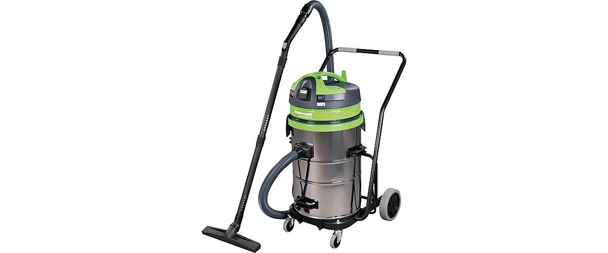 3-motorig mit Kupferwicklung und Motorschutz · Spezial-Dichtung zwischen Kopf und Behälter ist resistent gegen Öl- und Chemikalienreste · Stahlfahrwerk mit Fahrgriff · Kippvorrichtung · integrierte Steckdose, Anschlußwert 1000 Watt · Edelstahlbehälter