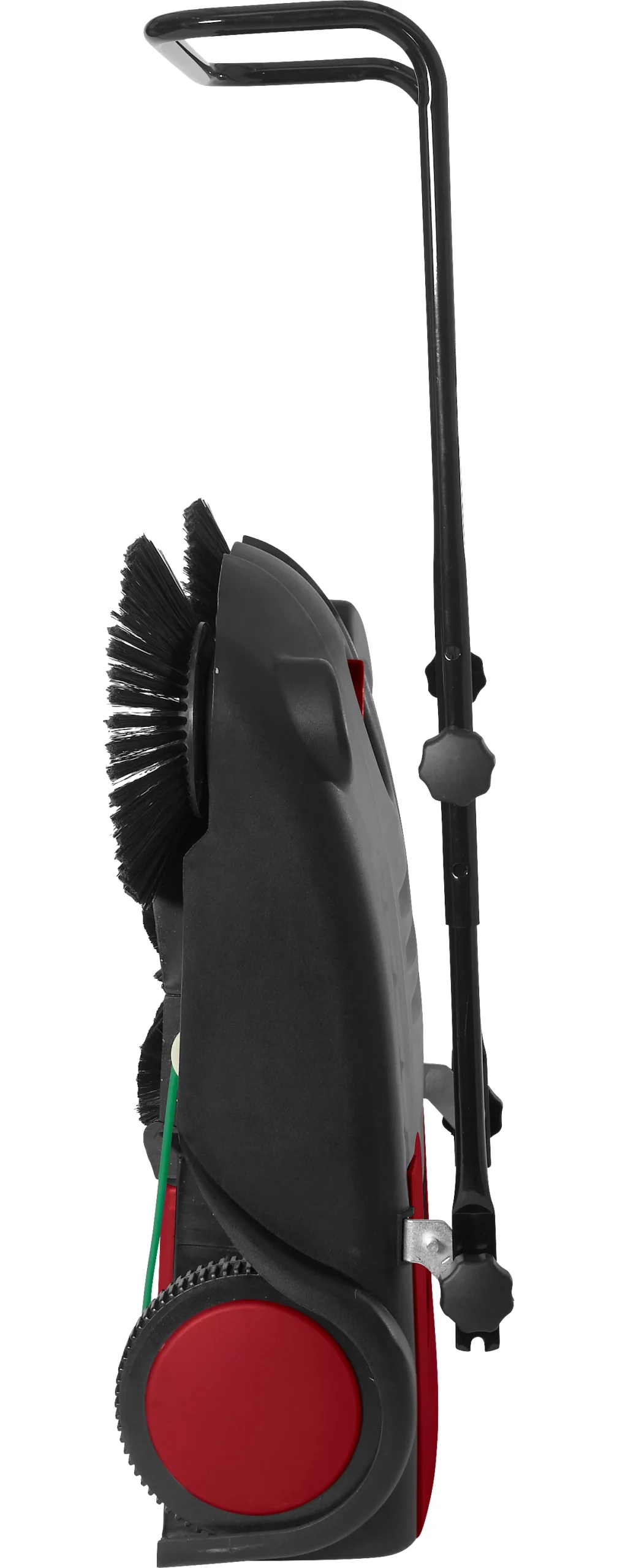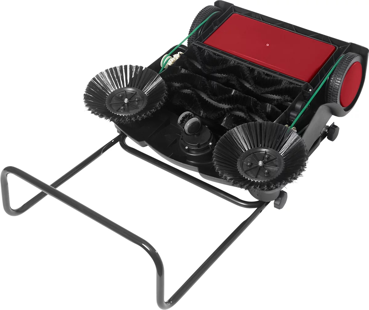 Die Arbeitsbreite der Kehrmaschine beträgt 670 mm, bei einer Gesamtlänge von 1100 mm (einschließlich Schubbügel) und einer Gesamtbreite von 670 mm (einschließlich Rundbürste). Mit einer Höhe von 980 mm und einem Gewicht von nur 8,5 kg können Sie sie einfach handeln und transportieren. Die manuelle Kehrmaschine verfügt über einen Kehrgutbehälter mit einer Kapazität von 14 Litern. Dieser lässt sich einfach entleeren. Wenn sie nicht in Gebrauch ist, können Sie die Kehrmaschine platzsparend zusammenklappen (660 x 580 x 245 mm).