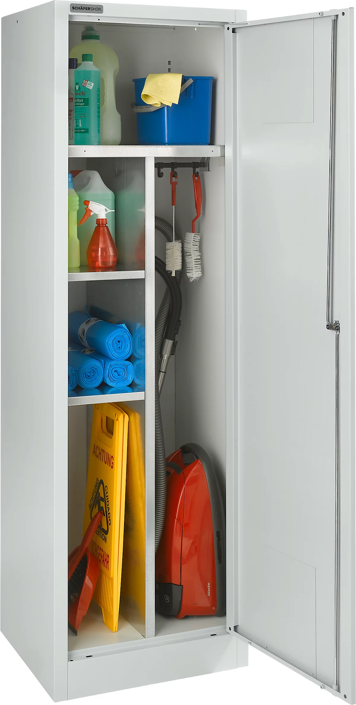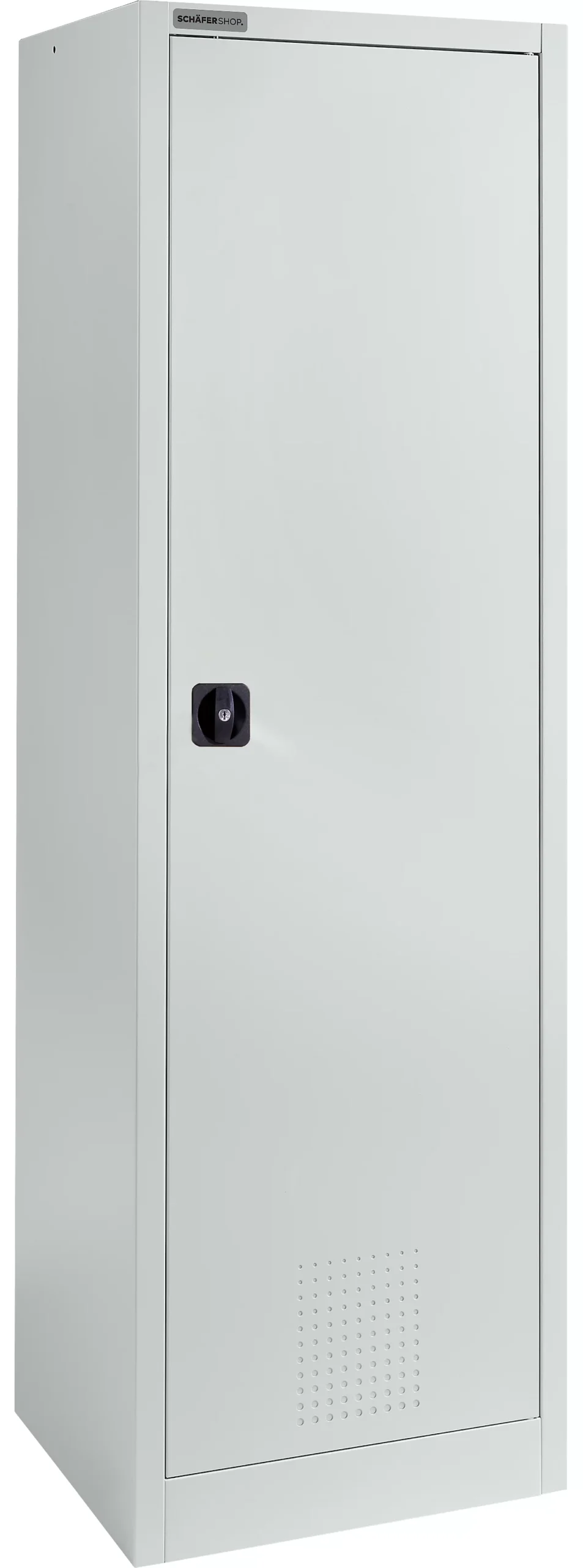 Hochwertiger Schäfer Shop Pure Putzmittelschrank aus pulverbeschichtetem Stahl in Lichtgrau (RAL 7035). Die robuste Flügeltür ist passiv belüftet – das Belüftungsfeld befindet sich unten in der Tür. Abschließbar durch im Drehmuschelgriff integriertes Zylinderschloss (inkl. 2 Schlüssel). Die Inneneinrichtung des Reinigungsmittelschranks besteht aus feuerverzinktem Stahlblech und bietet viel Stauraum.