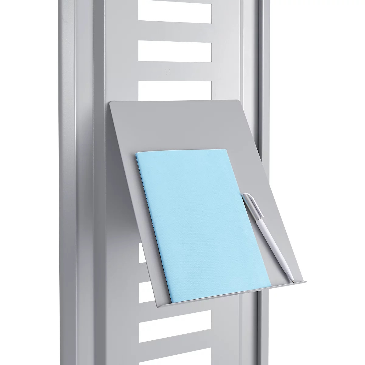 Als Bestandteil der modularen, variabel bestückbaren Hygienestation Basic von SSI Schäfer zeichnet sich diese Schreibplatte durch ein hohes Maß an Funktionalität aus. So dient sie ganz nach Wahl als praktische Unterlage bei der Anfertigung von Notizen direkt an der Station oder als Prospekthalter zur Auslage von wichtigen Dokumenten und Bekanntmachungen.