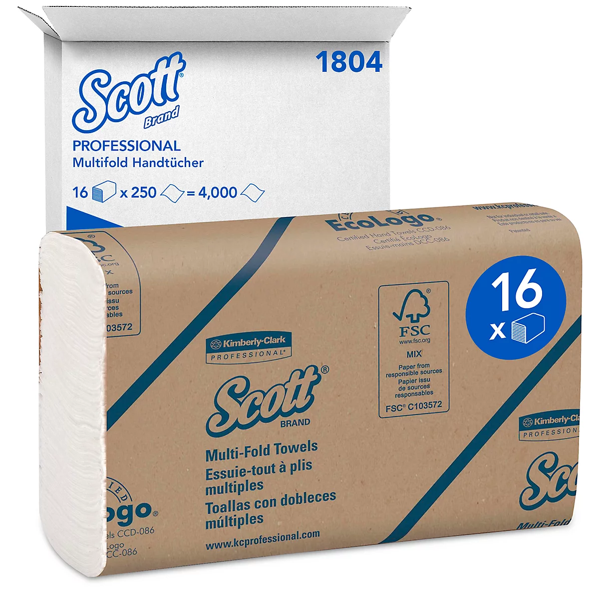 Die Falzung der einlagigen Handtücher sorgt dafür, dass sie einzeln entnommen werden. Auf diese Weise wird der Verbrauch deutlich verringert. Eine spezielle Mehrfachfaltung verhindert das Einreißen bei der Entnahme aus dem Handtuchspender. Die Scott Multifold Handtücher tragen das EcoLogo Zertifikat, da sie umweltfreundlich hergestellt werden.