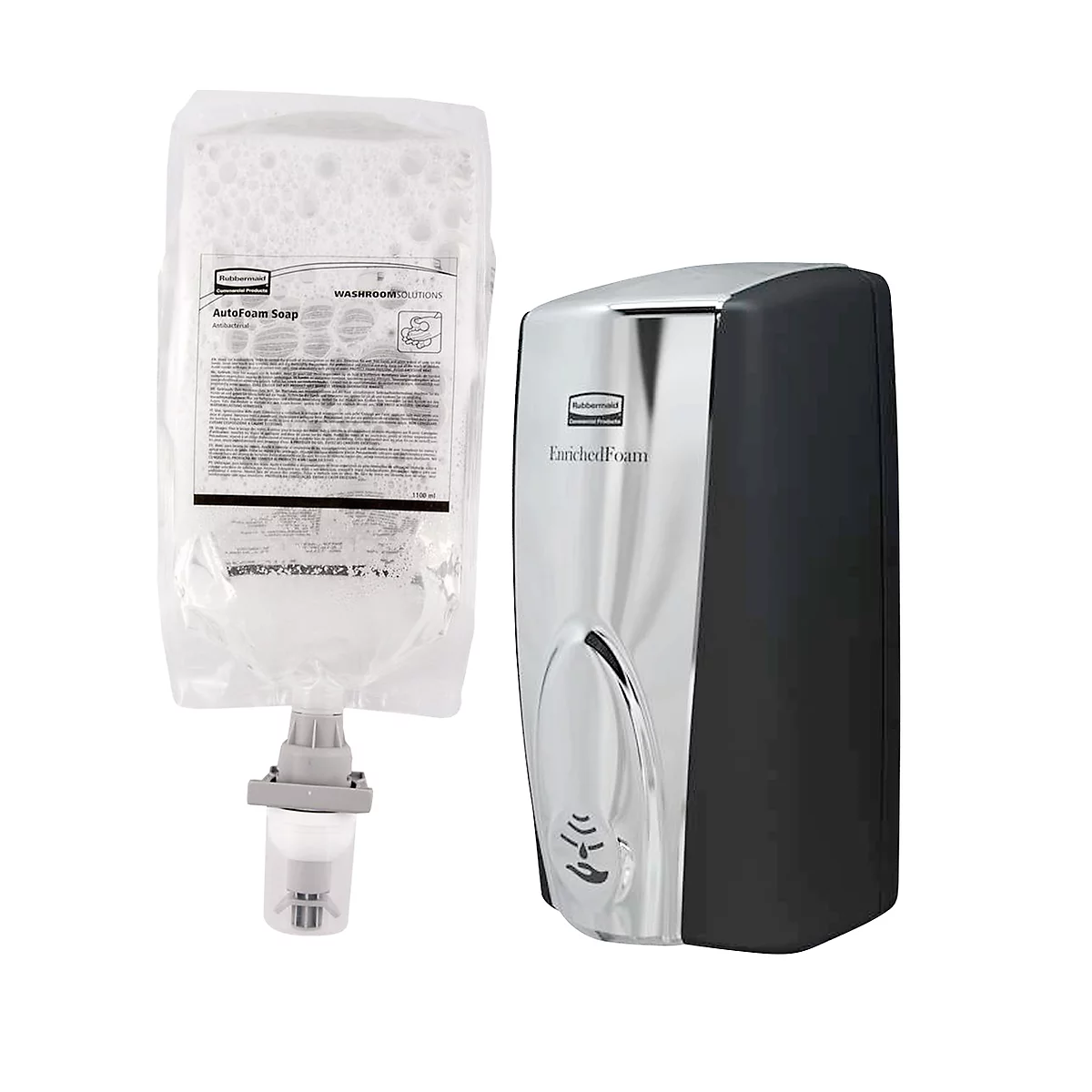 - Bestehend aus automatischem Seifen- und Desinfektionsspender AutoFoam von Rubbermaid sowie einem passendem, 1100 ml fassendem Nachfüllbeutel des Herstellers