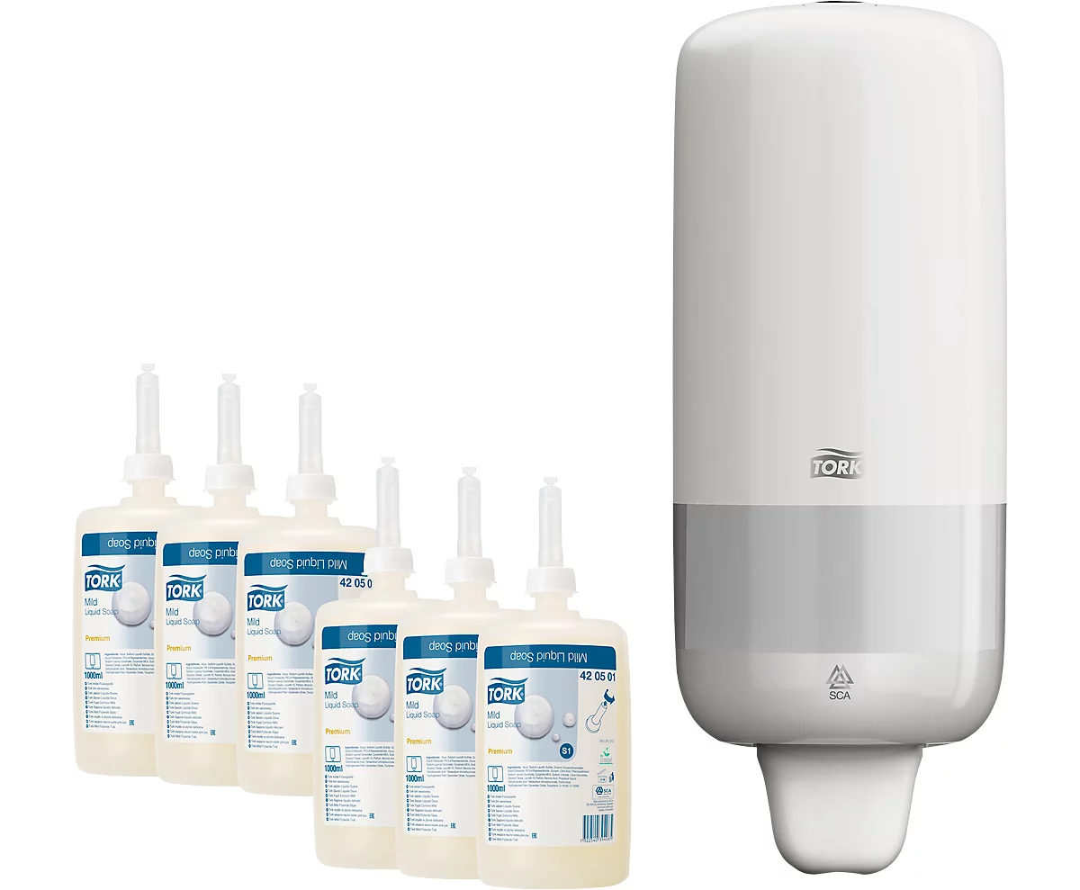 Dieses Sparset besteht aus dem Seifenspender für Flüssigseife und Desinfektionsgel von TORK® sowie 1 Karton mit jeweils 6 x 1 Liter TORK® Premium Flüssigseife.