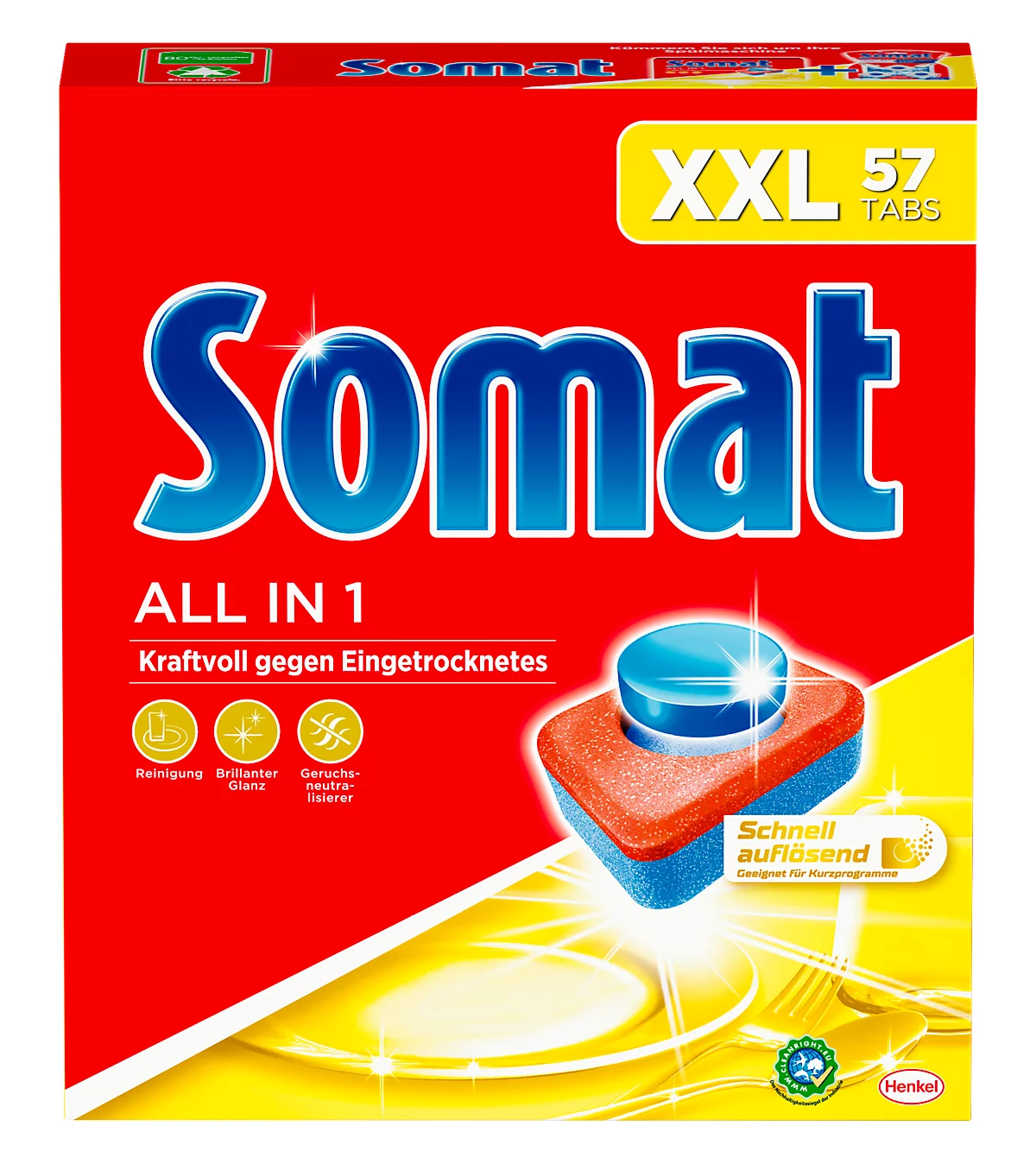 Die Spülmaschienentabs All in 1 XXL mit 3-fach-Wirkung von Somat liefern beste Ergebnis auch bei Niedrigtemperaturen – sie enthalten bereits den Klarspüler wie auch das Salz, sodass eine zusätzliche Beigabe für eine perfekte Geschirrreinigung entfällt.