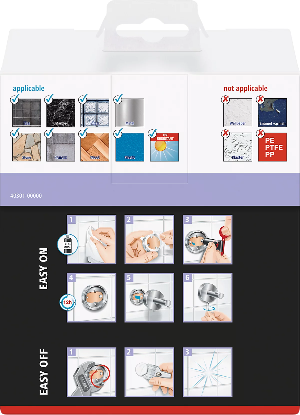 Toilettenpapier gehört sicherlich zu den wichtigsten Utensilien im Bad. Idealerweise ist dessen Aufbewahrung funktional und zugleich elegant. Genau das bietet der tesa® MOON Toilettenpapierhalter. Und dazu eine bequeme Montage, die ohne Bohren und Schäden am Untergrund auskommt. Nachdem Sie den Befestigungsadapter angebracht und mit der Klebmasse gefüllt haben, warten Sie 12 Stunden und können den Toilettenpapierhalter dauerhaft sicher anbringen. Trotz der hohen Haltekraft können Sie ihn jederzeit wieder entfernen und mit einem neuen Adapter (BK20) wiederverwenden. tesa.Power.Kit Glue: Achtung! Bei der Verwendung kann gefährlicher lungengängiger Staub entstehen. Staub nicht einatmen.