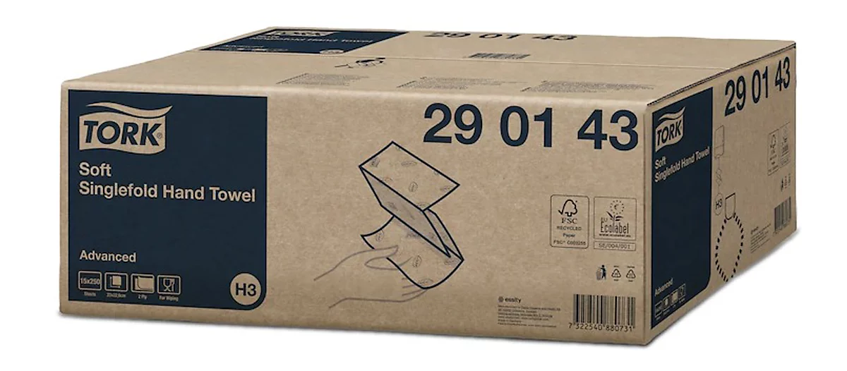 Sie erhalten die angenehm weichen Papierhandtücher Advanced® H3 290143 von Tork® in einem Karton mit 15 Pack. Ein jeder Pack enthält insgesamt 250 Blatt. Im gefalteten Zustand besitzt ein jedes Blatt die Maße von L 115 x B 226 mm, im entfalteten Zustand belaufen sich die Maße auf L 230 x B 226 mm.