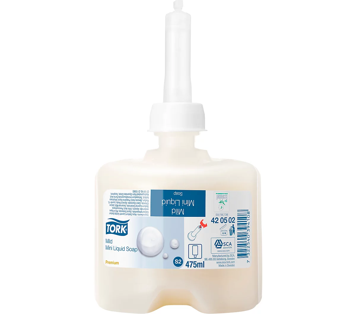 Es ist ebenfalls dermatologisch getestet und feuchtigkeitsspendend. Sie erhalten die perlmuttfarbene Flüssigseife Mini 420502 von Tork® in 8 Flakons à 0,475 Liter. Damit eignen sie sich für den Tork® Spender Mini.