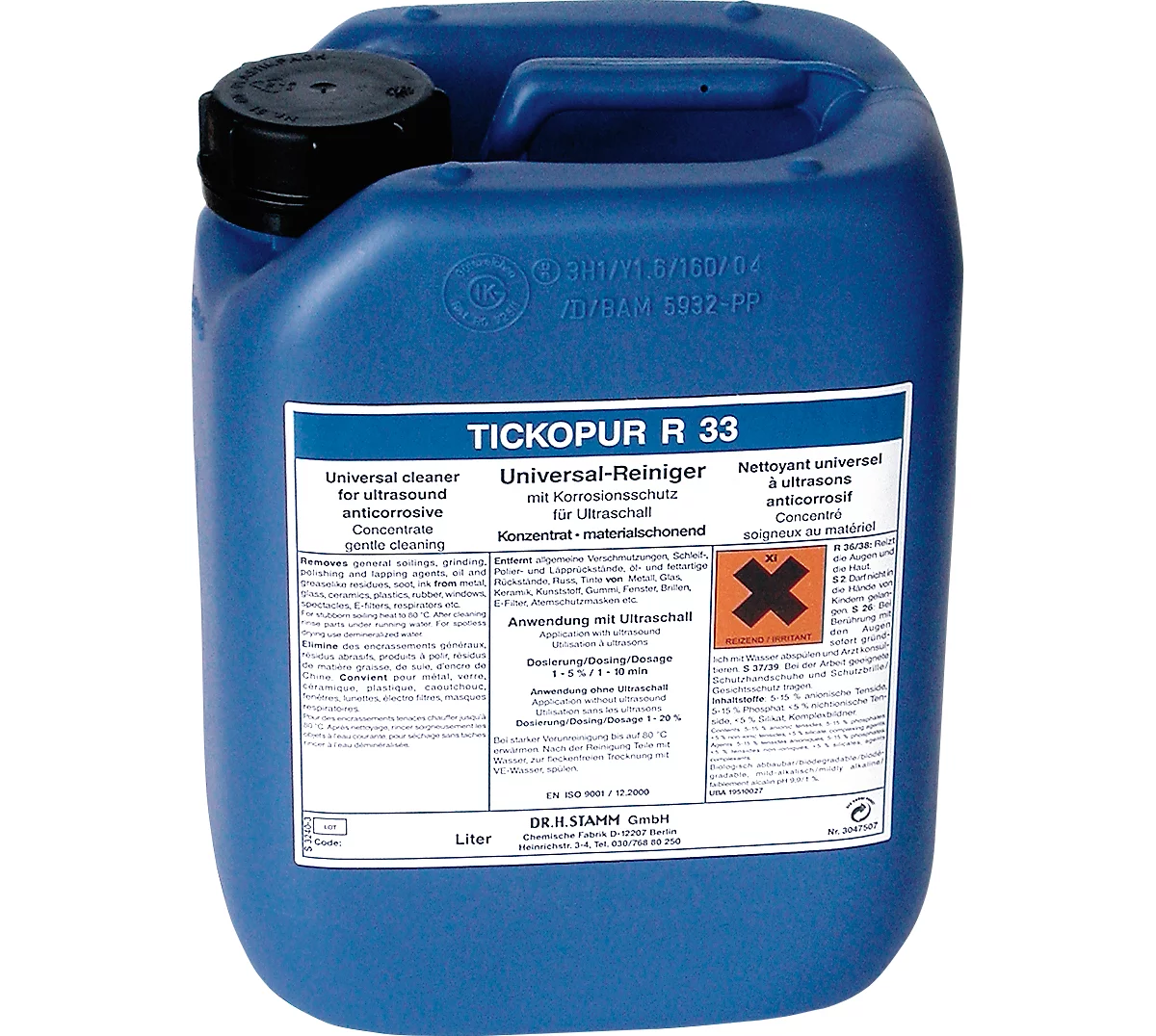 TICKOPUR R 33 ist ein Universalreiniger für Ultraschallanwendungen in hochkonzentrierter Form. Das Ultraschall-Reinigungskonzentrat eignet sich ideal zur Reinigung und Entfettung von zerlegten und nicht zerlegten Maschinen, Werkzeugen, Geräten und Teilen in Industrie, Handwerk Laboratorien. Es bewältigt auch stark verschmutzte Atemschutzmasken und sonstiges Arbeitsschutzzubehör.