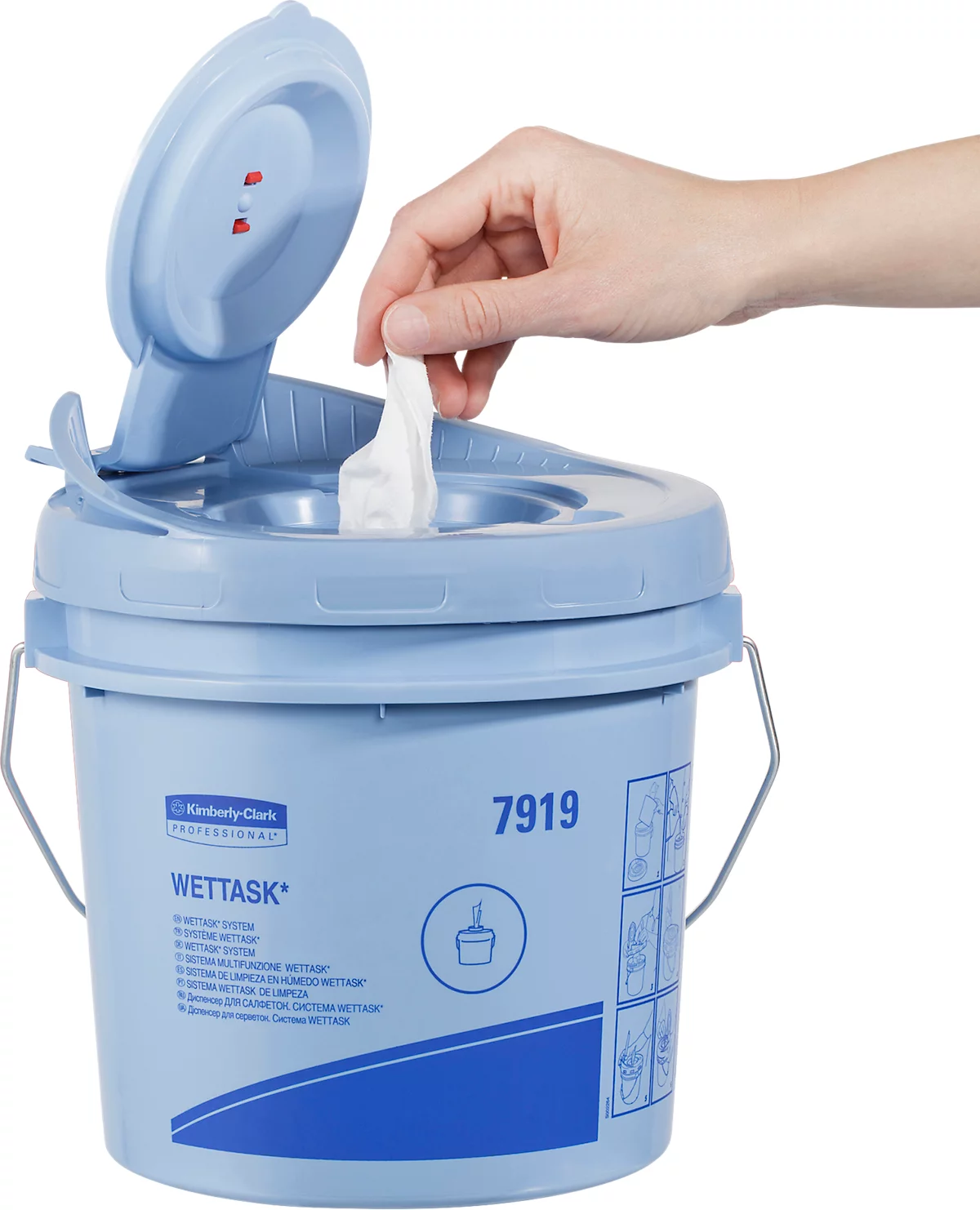 Die Tücher können mit Ihrem bevorzugten Reinigungsmittel durchtränkt werden. Dadurch wird eine effektive Reinigung gewährleistet. Verwenden Sie die Tücher mit dem nachfüllbaren Wettask™ Rollenspendereimer. Dies ist zudem ein luftdichtes Wischsystem. Durch den selbstschließenden Deckel des Wettask™ Systems wird der Kontakt von Mitarbeitern mit schädlichen VOCs reduziert. Das geschlossene System begrenzt zudem die Lösungsmittelkosten und verhindert Verschüttungen.
